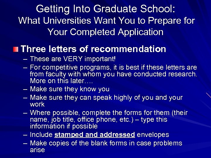 Getting Into Graduate School: What Universities Want You to Prepare for Your Completed Application Three letters of recommendation – These are VERY important! – For competitive programs, it is best if these letters are from faculty with whom you have conducted research. More on this later…. – Make sure they know you – Make sure they can speak highly of you and your work – Where possible, complete the forms for them (their name, job title, office phone, etc. ) – type this information if possible – Include stamped and addressed envelopes – Make copies of the blank forms in case problems arise