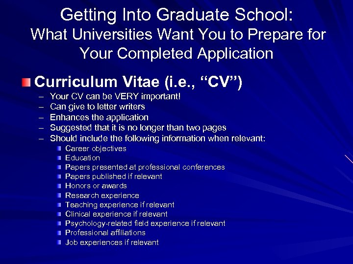 Getting Into Graduate School: What Universities Want You to Prepare for Your Completed Application Curriculum Vitae (i. e. , “CV”) – – – Your CV can be VERY important! Can give to letter writers Enhances the application Suggested that it is no longer than two pages Should include the following information when relevant: Career objectives Education Papers presented at professional conferences Papers published if relevant Honors or awards Research experience Teaching experience if relevant Clinical experience if relevant Psychology-related field experience if relevant Professional affiliations Job experiences if relevant