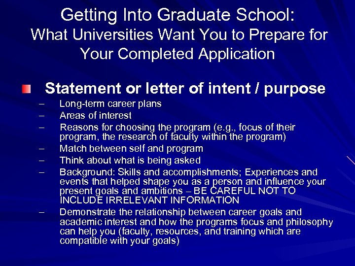 Getting Into Graduate School: What Universities Want You to Prepare for Your Completed Application Statement or letter of intent / purpose – – – – Long-term career plans Areas of interest Reasons for choosing the program (e. g. , focus of their program, the research of faculty within the program) Match between self and program Think about what is being asked Background: Skills and accomplishments; Experiences and events that helped shape you as a person and influence your present goals and ambitions – BE CAREFUL NOT TO INCLUDE IRRELEVANT INFORMATION Demonstrate the relationship between career goals and academic interest and how the programs focus and philosophy can help you (faculty, resources, and training which are compatible with your goals)