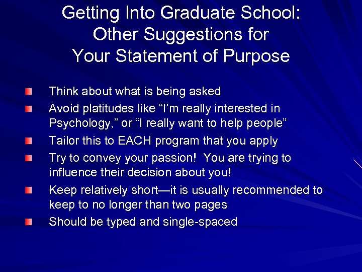 Getting Into Graduate School: Other Suggestions for Your Statement of Purpose Think about what is being asked Avoid platitudes like “I’m really interested in Psychology, ” or “I really want to help people” Tailor this to EACH program that you apply Try to convey your passion! You are trying to influence their decision about you! Keep relatively short—it is usually recommended to keep to no longer than two pages Should be typed and single-spaced