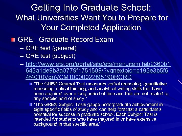 Getting Into Graduate School: What Universities Want You to Prepare for Your Completed Application GRE: Graduate Record Exam – GRE test (general) – GRE test (subject) – http: //www. ets. org/portal/site/ets/menuitem. fab 2360 b 1 645 a 1 de 9 b 3 a 0779 f 1751509/? vgnextoid=b 195 e 3 b 5 f 6 4 f 4010 Vgn. VCM 10000022 f 95190 RCRD “The GRE® General Test measures verbal reasoning, quantitative reasoning, critical thinking, and analytical writing skills that have been acquired over a long period of time and that are not related to any specific field of study. ” “The GRE® Subject Tests gauge undergraduate achievement in eight specific fields of study and can help forecast a candidate's potential for success in graduate school. Each Subject Test is intended for students who have majored in or have extensive background in that specific area. ”