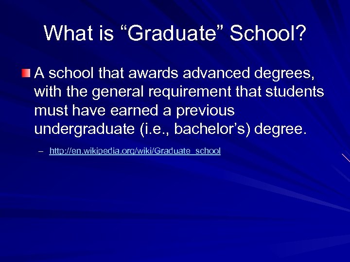 What is “Graduate” School? A school that awards advanced degrees, with the general requirement that students must have earned a previous undergraduate (i. e. , bachelor’s) degree. – http: //en. wikipedia. org/wiki/Graduate_school