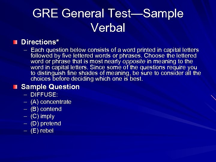 GRE General Test—Sample Verbal Directions* – Each question below consists of a word printed in capital letters followed by five lettered words or phrases. Choose the lettered word or phrase that is most nearly opposite in meaning to the word in capital letters. Since some of the questions require you to distinguish fine shades of meaning, be sure to consider all the choices before deciding which one is best. Sample Question – – – DIFFUSE: (A) concentrate (B) contend (C) imply (D) pretend (E) rebel