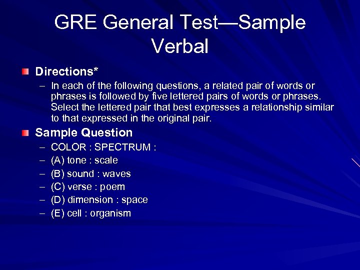 GRE General Test—Sample Verbal Directions* – In each of the following questions, a related pair of words or phrases is followed by five lettered pairs of words or phrases. Select the lettered pair that best expresses a relationship similar to that expressed in the original pair. Sample Question – – – COLOR : SPECTRUM : (A) tone : scale (B) sound : waves (C) verse : poem (D) dimension : space (E) cell : organism