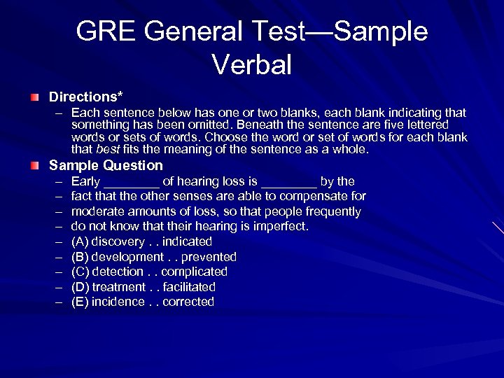 GRE General Test—Sample Verbal Directions* – Each sentence below has one or two blanks, each blank indicating that something has been omitted. Beneath the sentence are five lettered words or sets of words. Choose the word or set of words for each blank that best fits the meaning of the sentence as a whole. Sample Question – – – – – Early ____ of hearing loss is ____ by the fact that the other senses are able to compensate for moderate amounts of loss, so that people frequently do not know that their hearing is imperfect. (A) discovery. . indicated (B) development. . prevented (C) detection. . complicated (D) treatment. . facilitated (E) incidence. . corrected