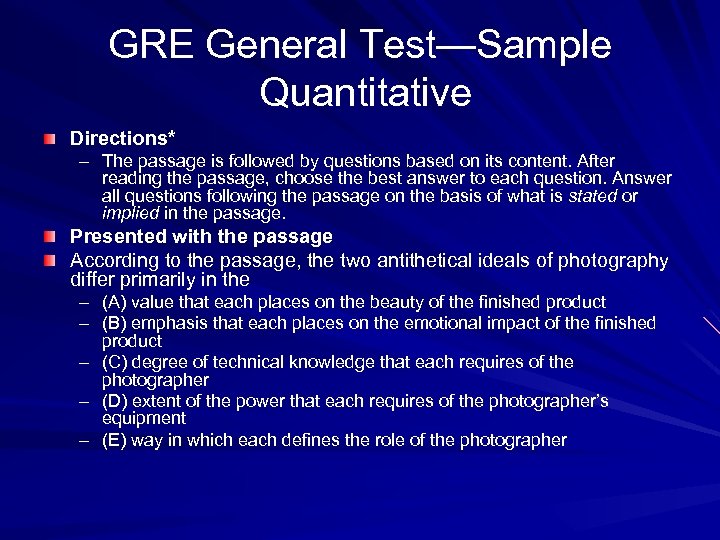GRE General Test—Sample Quantitative Directions* – The passage is followed by questions based on its content. After reading the passage, choose the best answer to each question. Answer all questions following the passage on the basis of what is stated or implied in the passage. Presented with the passage According to the passage, the two antithetical ideals of photography differ primarily in the – (A) value that each places on the beauty of the finished product – (B) emphasis that each places on the emotional impact of the finished product – (C) degree of technical knowledge that each requires of the photographer – (D) extent of the power that each requires of the photographer’s equipment – (E) way in which each defines the role of the photographer