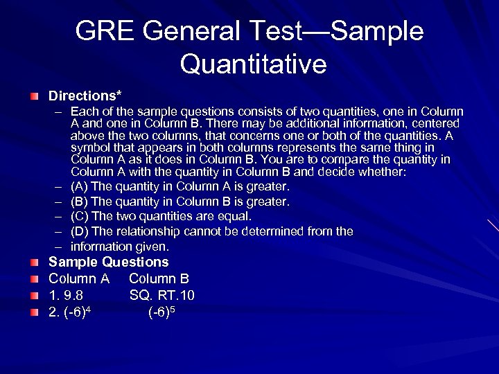 GRE General Test—Sample Quantitative Directions* – Each of the sample questions consists of two quantities, one in Column A and one in Column B. There may be additional information, centered above the two columns, that concerns one or both of the quantities. A symbol that appears in both columns represents the same thing in Column A as it does in Column B. You are to compare the quantity in Column A with the quantity in Column B and decide whether: – (A) The quantity in Column A is greater. – (B) The quantity in Column B is greater. – (C) The two quantities are equal. – (D) The relationship cannot be determined from the – information given. Sample Questions Column A Column B 1. 9. 8 SQ. RT. 10 2. (-6)4 (-6)5