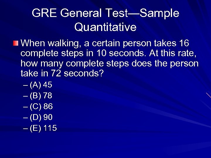 GRE General Test—Sample Quantitative When walking, a certain person takes 16 complete steps in 10 seconds. At this rate, how many complete steps does the person take in 72 seconds? – (A) 45 – (B) 78 – (C) 86 – (D) 90 – (E) 115