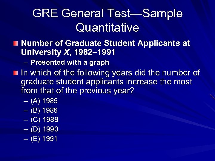 GRE General Test—Sample Quantitative Number of Graduate Student Applicants at University X, 1982– 1991 – Presented with a graph In which of the following years did the number of graduate student applicants increase the most from that of the previous year? – – – (A) 1985 (B) 1986 (C) 1988 (D) 1990 (E) 1991