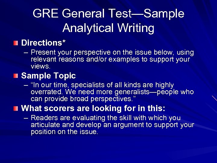 GRE General Test—Sample Analytical Writing Directions* – Present your perspective on the issue below, using relevant reasons and/or examples to support your views. Sample Topic – “In our time, specialists of all kinds are highly overrated. We need more generalists—people who can provide broad perspectives. ” What scorers are looking for in this: – Readers are evaluating the skill with which you articulate and develop an argument to support your position on the issue.