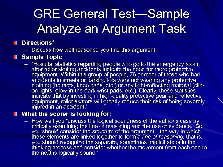 GRE General Test—Sample Analyze an Argument Task Directions* – Discuss how well reasoned you find this argument. Sample Topic – “Hospital statistics regarding people who go to the emergency room after roller skating accidents indicate the need for more protective equipment. Within this group of people, 75 percent of those who had accidents in streets or parking lots were not wearing any protective clothing (helmets, knee pads, etc. ) or any light-reflecting material (clipon lights, glow-in-the-dark wrist pads, etc. ). Clearly, these statistics indicate that by investing in high-quality protective gear and reflective equipment, roller skaters will greatly reduce their risk of being severely injured in an accident. ” What the scorer is looking for: – How well you “discuss the logical soundness of the author’s case by critically examining the line of reasoning and the use of evidence. So, you should consider the structure of the argument—the way in which these elements are linked together to form a line of reasoning; that is, you should recognize the separate, sometimes implicit steps in the thinking process and consider whether the movement from each one to the next is logically sound. ”