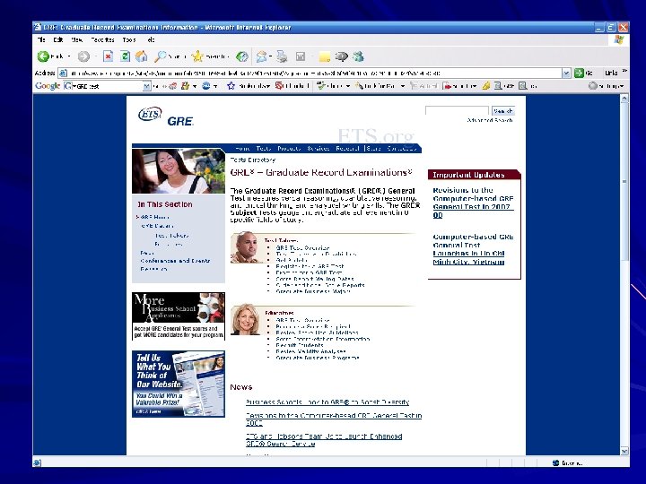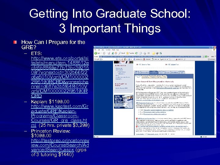 Getting Into Graduate School: 3 Important Things How Can I Prepare for the GRE? – ETS: http: //www. ets. org/portal/si te/ets/menuitem. 1488512 e cfd 5 b 8849 a 77 b 13 bc 39215 09/? vgnextoid=302 b 66 f 22 c 6 a 5010 Vgn. VCM 1000002 2 f 95190 RCRD&vgnextcha nnel=d 687 e 3 b 5 f 64 f 4010 V gn. VCM 10000022 f 95190 R CRD – Kaplan: $1199. 00 http: //www. kaptest. com/Gr aduate/GRE/Kaplan. Programs/Classroom. Courses/GR_gre_class. ht ml (25 hrs. private $3, 299) – Princeton Review: $1099. 00 http: //testprep. princetonrev iew. com/Course. Search/Ad vanced. Search. aspx (grps of 3 tutoring $1440)