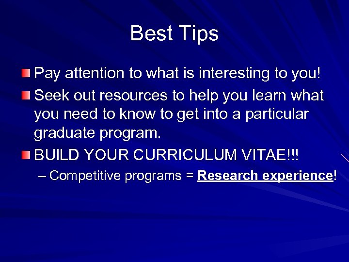 Best Tips Pay attention to what is interesting to you! Seek out resources to help you learn what you need to know to get into a particular graduate program. BUILD YOUR CURRICULUM VITAE!!! – Competitive programs = Research experience!