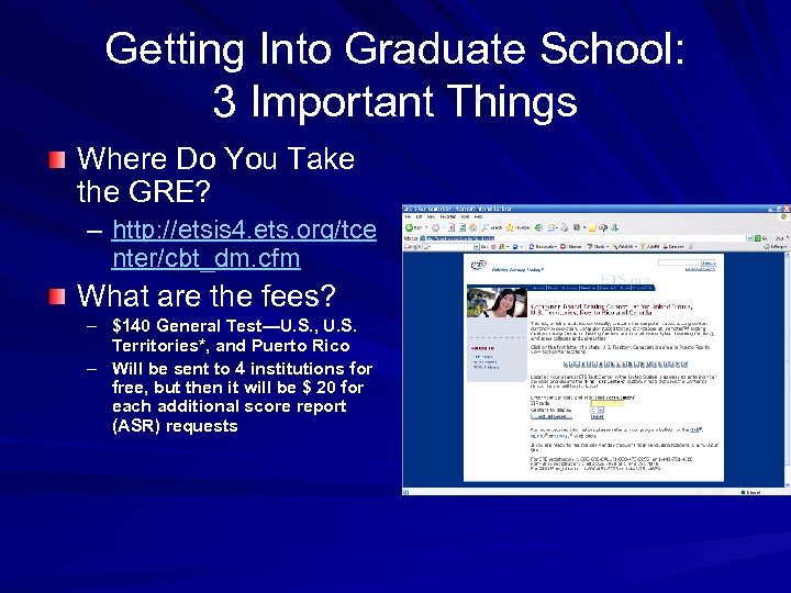 Getting Into Graduate School: 3 Important Things Where Do You Take the GRE? – http: //etsis 4. ets. org/tce nter/cbt_dm. cfm What are the fees? – $140 General Test—U. S. , U. S. Territories*, and Puerto Rico – Will be sent to 4 institutions for free, but then it will be $ 20 for each additional score report (ASR) requests