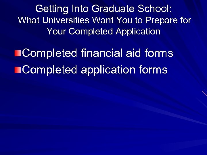 Getting Into Graduate School: What Universities Want You to Prepare for Your Completed Application Completed financial aid forms Completed application forms