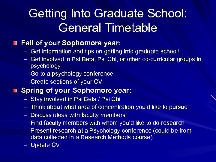Getting Into Graduate School: General Timetable Fall of your Sophomore year: – Get information and tips on getting into graduate school! – Get involved in Psi Beta, Psi Chi, or other co-curricular groups in psychology – Go to a psychology conference – Create sections of your CV Spring of your Sophomore year: – – – Stay involved in Psi Beta / Psi Chi Think about what area of concentration you’d like to pursue Discuss ideas with faculty members Find faculty members with whom you’d like to do research Present research at a Psychology conference (could be from data collected in a Research Methods course) – Update CV