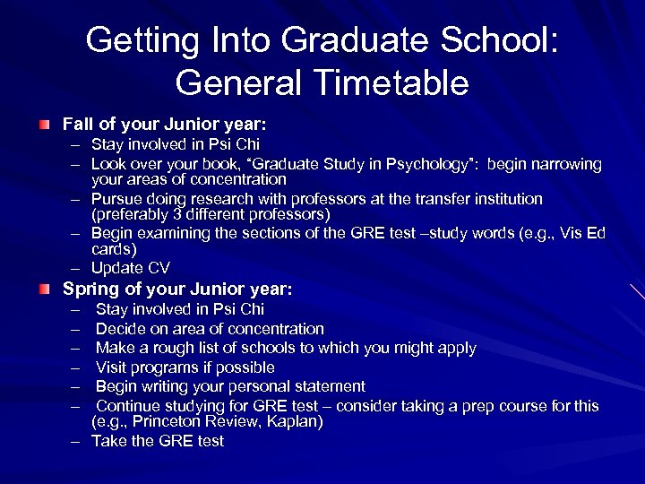 Getting Into Graduate School: General Timetable Fall of your Junior year: – Stay involved in Psi Chi – Look over your book, “Graduate Study in Psychology”: begin narrowing your areas of concentration – Pursue doing research with professors at the transfer institution (preferably 3 different professors) – Begin examining the sections of the GRE test –study words (e. g. , Vis Ed cards) – Update CV Spring of your Junior year: – – – Stay involved in Psi Chi Decide on area of concentration Make a rough list of schools to which you might apply Visit programs if possible Begin writing your personal statement Continue studying for GRE test – consider taking a prep course for this (e. g. , Princeton Review, Kaplan) – Take the GRE test