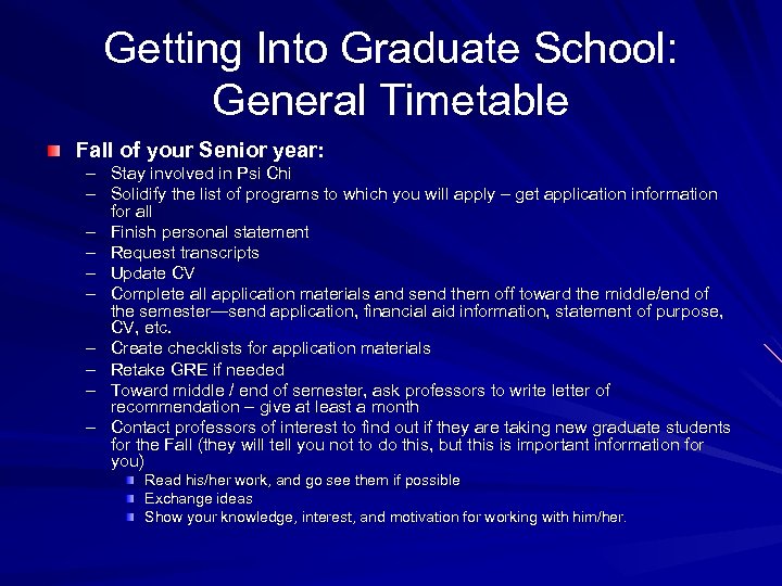 Getting Into Graduate School: General Timetable Fall of your Senior year: – Stay involved in Psi Chi – Solidify the list of programs to which you will apply – get application information for all – Finish personal statement – Request transcripts – Update CV – Complete all application materials and send them off toward the middle/end of the semester—send application, financial aid information, statement of purpose, CV, etc. – Create checklists for application materials – Retake GRE if needed – Toward middle / end of semester, ask professors to write letter of recommendation – give at least a month – Contact professors of interest to find out if they are taking new graduate students for the Fall (they will tell you not to do this, but this is important information for you) Read his/her work, and go see them if possible Exchange ideas Show your knowledge, interest, and motivation for working with him/her.