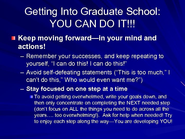 Getting Into Graduate School: YOU CAN DO IT!!! Keep moving forward—in your mind actions! – Remember your successes, and keep repeating to yourself, “I can do this!” – Avoid self-defeating statements (“This is too much, ” I can’t do this, ” Who would even want me? ”) – Stay focused on one step at a time To avoid getting overwhelmed, write your goals down, and then only concentrate on completing the NEXT needed step (don’t focus on ALL the things you need to do across all the years…. too overwhelming!). Ask for help when needed! Try to enjoy each step along the way—You are developing YOU!