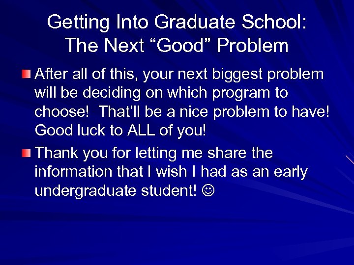 Getting Into Graduate School: The Next “Good” Problem After all of this, your next biggest problem will be deciding on which program to choose! That’ll be a nice problem to have! Good luck to ALL of you! Thank you for letting me share the information that I wish I had as an early undergraduate student!