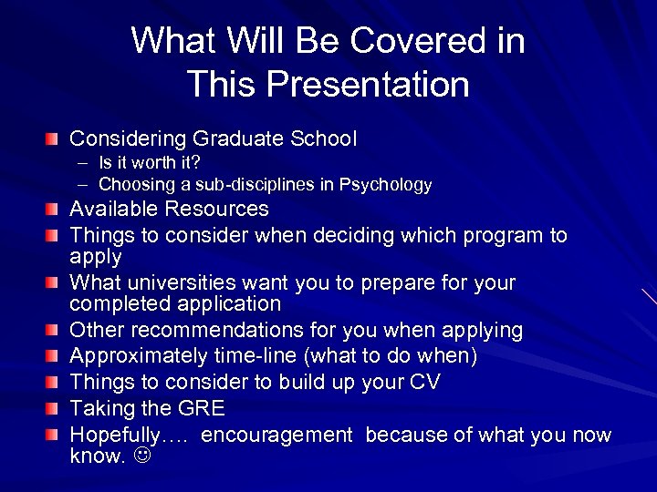 What Will Be Covered in This Presentation Considering Graduate School – Is it worth it? – Choosing a sub-disciplines in Psychology Available Resources Things to consider when deciding which program to apply What universities want you to prepare for your completed application Other recommendations for you when applying Approximately time-line (what to do when) Things to consider to build up your CV Taking the GRE Hopefully…. encouragement because of what you now know.