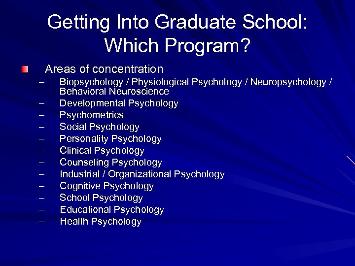 Getting Into Graduate School: Which Program? Areas of concentration – – – Biopsychology / Physiological Psychology / Neuropsychology / Behavioral Neuroscience Developmental Psychology Psychometrics Social Psychology Personality Psychology Clinical Psychology Counseling Psychology Industrial / Organizational Psychology Cognitive Psychology School Psychology Educational Psychology Health Psychology