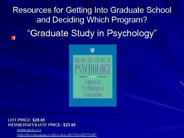 Resources for Getting Into Graduate School and Deciding Which Program? “Graduate Study in Psychology” LIST PRICE: $28. 95 MEMBER/AFFILIATE PRICE: $23. 95 www. apa. org http: //books. apa. org/books. cfm? id=4270091