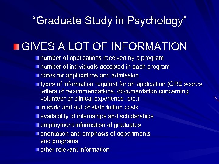 “Graduate Study in Psychology” GIVES A LOT OF INFORMATION number of applications received by a program number of individuals accepted in each program dates for applications and admission types of information required for an application (GRE scores, letters of recommendations, documentation concerning volunteer or clinical experience, etc. ) in-state and out-of-state tuition costs availability of internships and scholarships employment information of graduates orientation and emphasis of departments and programs other relevant information