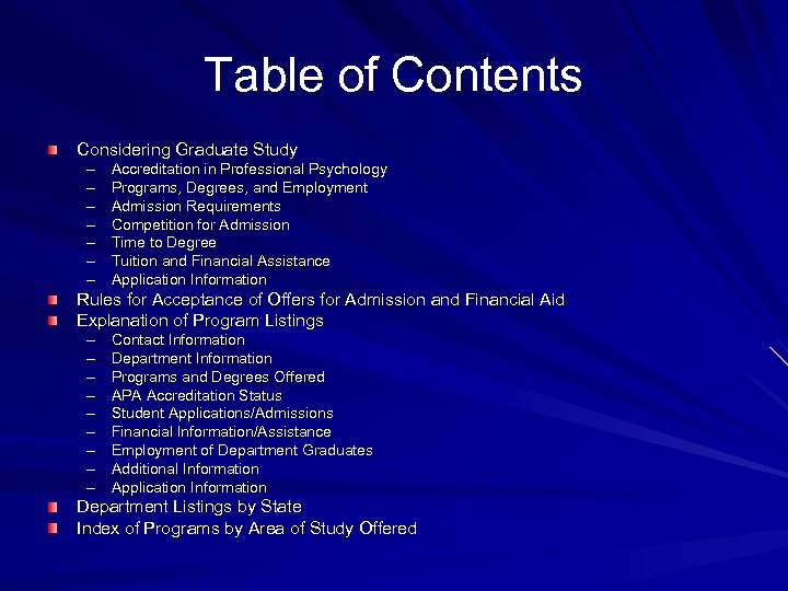 Table of Contents Considering Graduate Study – – – – Accreditation in Professional Psychology Programs, Degrees, and Employment Admission Requirements Competition for Admission Time to Degree Tuition and Financial Assistance Application Information Rules for Acceptance of Offers for Admission and Financial Aid Explanation of Program Listings – – – – – Contact Information Department Information Programs and Degrees Offered APA Accreditation Status Student Applications/Admissions Financial Information/Assistance Employment of Department Graduates Additional Information Application Information Department Listings by State Index of Programs by Area of Study Offered