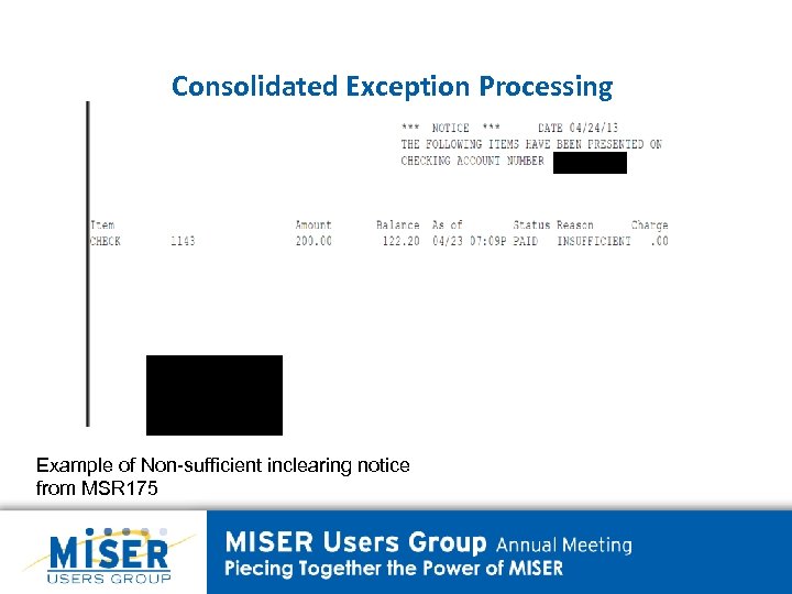 Consolidated Exception Processing Example of Non-sufficient inclearing notice from MSR 175