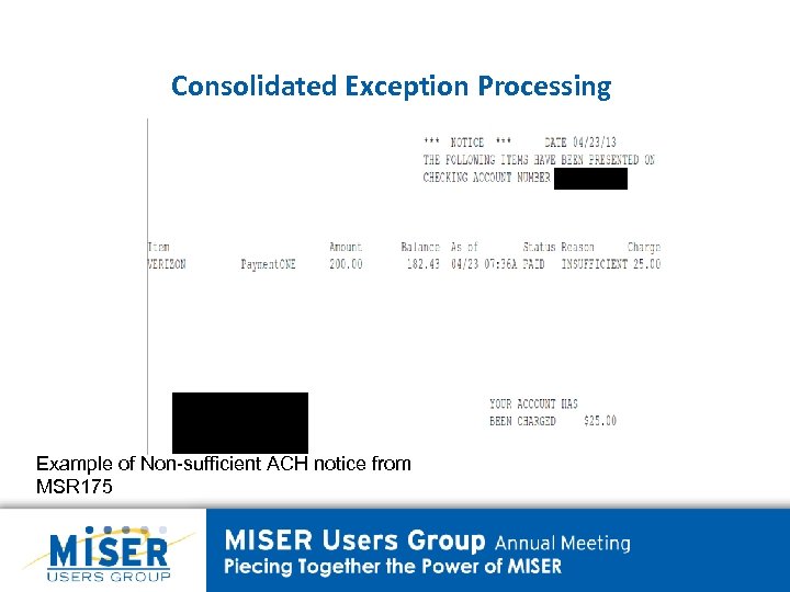 Consolidated Exception Processing Example of Non-sufficient ACH notice from MSR 175