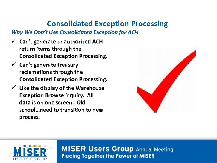 Consolidated Exception Processing Why We Don’t Use Consolidated Exception for ACH ü Can’t generate unauthorized ACH return items through the Consolidated Exception Processing. ü Can’t generate treasury reclamations through the Consolidated Exception Processing. ü Like the display of the Warehouse Exception Browse inquiry. All data is on one screen. Old school…need to transition to new process.