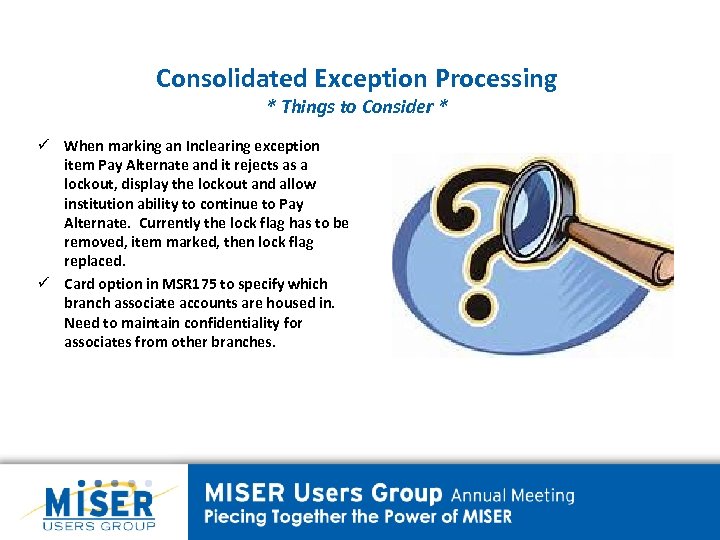 Consolidated Exception Processing * Things to Consider * ü When marking an Inclearing exception item Pay Alternate and it rejects as a lockout, display the lockout and allow institution ability to continue to Pay Alternate. Currently the lock flag has to be removed, item marked, then lock flag replaced. ü Card option in MSR 175 to specify which branch associate accounts are housed in. Need to maintain confidentiality for associates from other branches.
