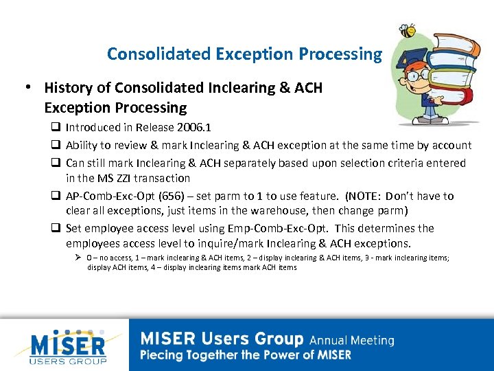 Consolidated Exception Processing • History of Consolidated Inclearing & ACH Exception Processing q Introduced in Release 2006. 1 q Ability to review & mark Inclearing & ACH exception at the same time by account q Can still mark Inclearing & ACH separately based upon selection criteria entered in the MS ZZI transaction q AP-Comb-Exc-Opt (656) – set parm to 1 to use feature. (NOTE: Don’t have to clear all exceptions, just items in the warehouse, then change parm) q Set employee access level using Emp-Comb-Exc-Opt. This determines the employees access level to inquire/mark Inclearing & ACH exceptions. Ø 0 – no access, 1 – mark inclearing & ACH items, 2 – display inclearing & ACH items, 3 - mark inclearing items; display ACH items, 4 – display inclearing items mark ACH items
