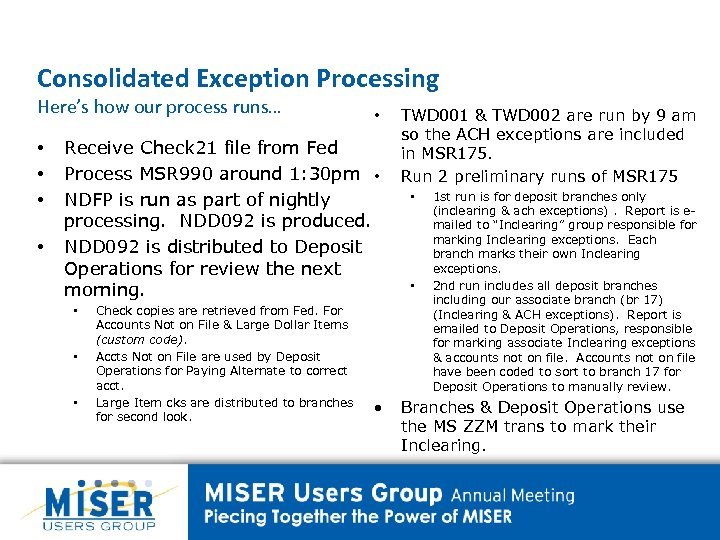 Consolidated Exception Processing Here’s how our process runs… • • • Receive Check 21 file from Fed Process MSR 990 around 1: 30 pm • NDFP is run as part of nightly processing. NDD 092 is produced. NDD 092 is distributed to Deposit Operations for review the next morning. • • • Check copies are retrieved from Fed. For Accounts Not on File & Large Dollar Items (custom code). Accts Not on File are used by Deposit Operations for Paying Alternate to correct acct. Large Item cks are distributed to branches for second look. • TWD 001 & TWD 002 are run by 9 am so the ACH exceptions are included in MSR 175. Run 2 preliminary runs of MSR 175 • • 1 st run is for deposit branches only (inclearing & ach exceptions). Report is emailed to “Inclearing” group responsible for marking Inclearing exceptions. Each branch marks their own Inclearing exceptions. 2 nd run includes all deposit branches including our associate branch (br 17) (Inclearing & ACH exceptions). Report is emailed to Deposit Operations, responsible for marking associate Inclearing exceptions & accounts not on file. Accounts not on file have been coded to sort to branch 17 for Deposit Operations to manually review. Branches & Deposit Operations use the MS ZZM trans to mark their Inclearing.