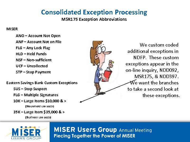 Consolidated Exception Processing MSR 175 Exception Abbreviations MISER ANO – Account Not Open ANF – Account Not on File FLG – Any Lock Flag HLD – Held Funds NSF – Non-sufficient UCF – Uncollected STP – Stop Payment Eastern Savings Bank Custom Exceptions SUS – Stop Suspect FLG – Multiple Signatures 10 K – Large Items $10, 000 & > (Household use accts) 35 K – Large Item $35, 000 & > (Business use accts) We custom coded additional exceptions in NDFP. These custom exceptions appear in the on-line inquiry, NDD 092, MSR 175, & NDD 397. We want the branches to take a second look at these exceptions.
