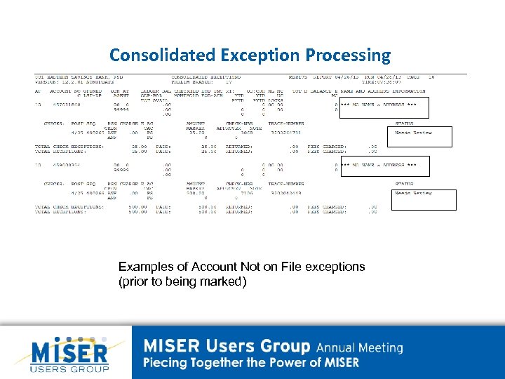 Consolidated Exception Processing Examples of Account Not on File exceptions (prior to being marked)
