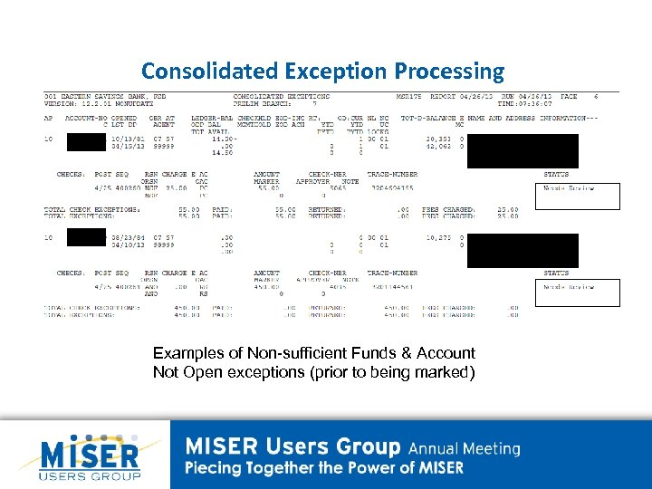 Consolidated Exception Processing Examples of Non-sufficient Funds & Account Not Open exceptions (prior to being marked)
