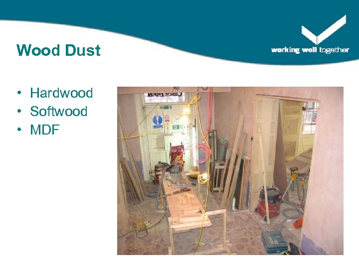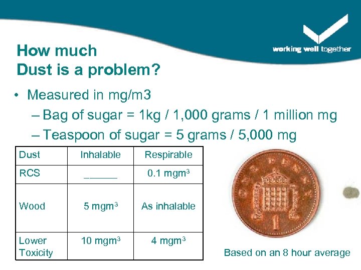 How much Dust is a problem? • Measured in mg/m 3 – Bag of sugar = 1 kg / 1, 000 grams / 1 million mg – Teaspoon of sugar = 5 grams / 5, 000 mg Dust Inhalable Respirable RCS ______ 0. 1 mgm 3 Wood 5 mgm 3 As inhalable Lower Toxicity 10 mgm 3 4 mgm 3 Based on an 8 hour average