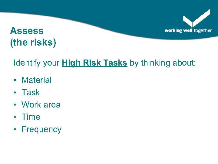 Assess (the risks) Identify your High Risk Tasks by thinking about: • • • Material Task Work area Time Frequency
