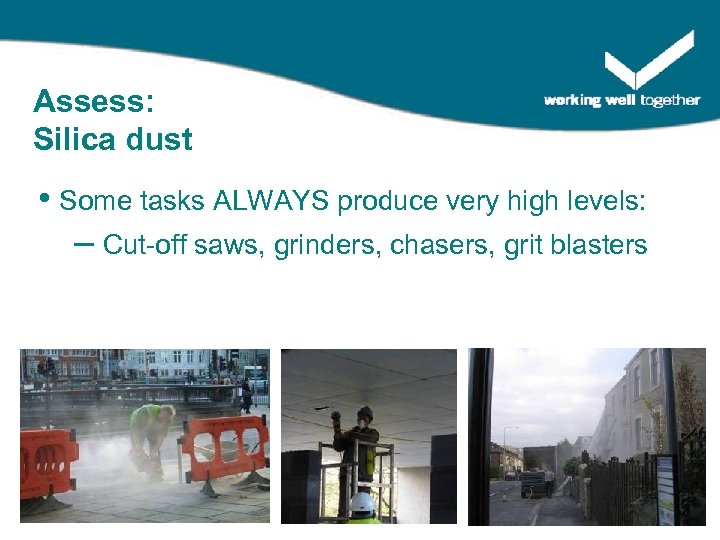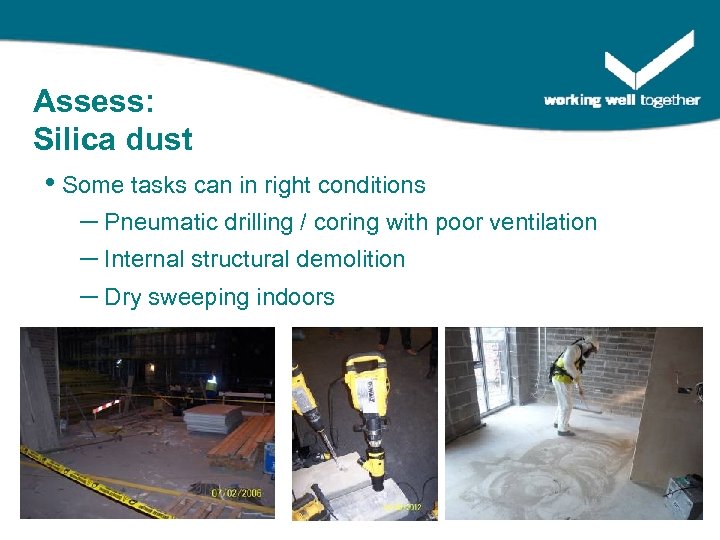 Assess: Silica dust • Some tasks can in right conditions – Pneumatic drilling / coring with poor ventilation – Internal structural demolition – Dry sweeping indoors