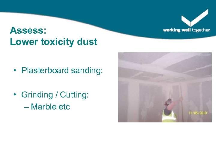 Assess: Lower toxicity dust • Plasterboard sanding: • Grinding / Cutting: – Marble etc