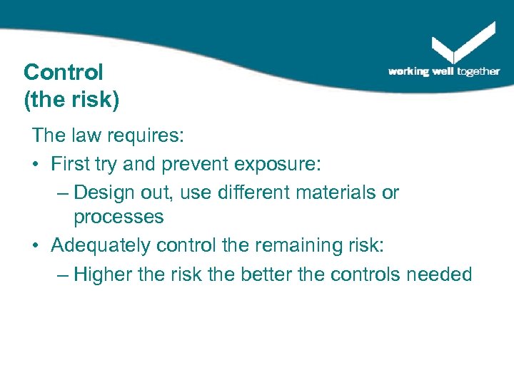 Control (the risk) The law requires: • First try and prevent exposure: – Design out, use different materials or processes • Adequately control the remaining risk: – Higher the risk the better the controls needed
