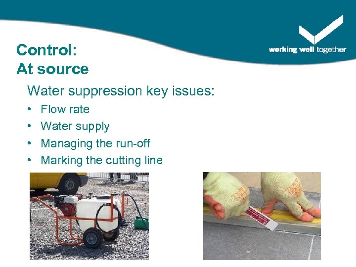 Control: At source Water suppression key issues: • • Flow rate Water supply Managing the run-off Marking the cutting line