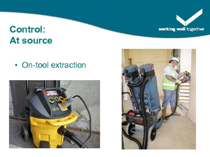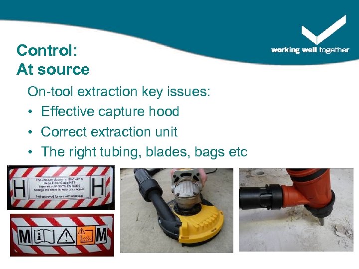 Control: At source On-tool extraction key issues: • Effective capture hood • Correct extraction unit • The right tubing, blades, bags etc