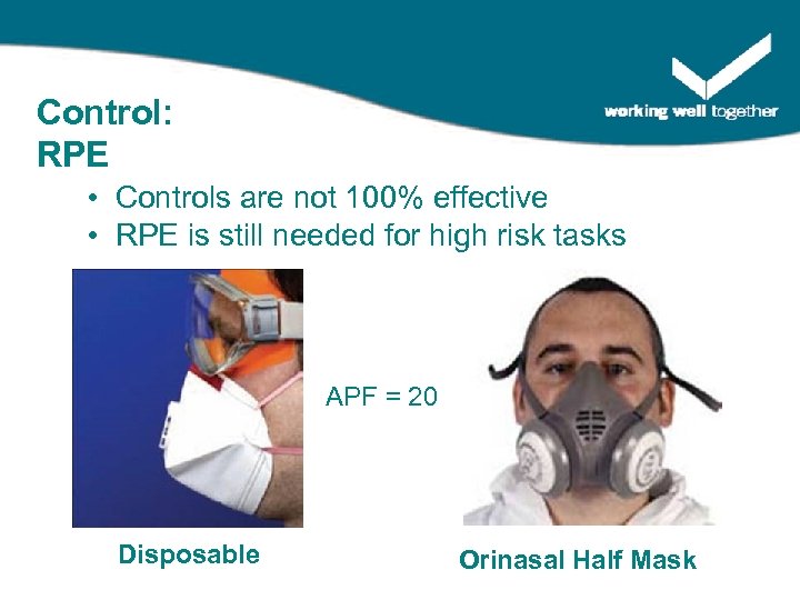 Control: RPE • Controls are not 100% effective • RPE is still needed for high risk tasks APF = 20 Disposable Orinasal Half Mask