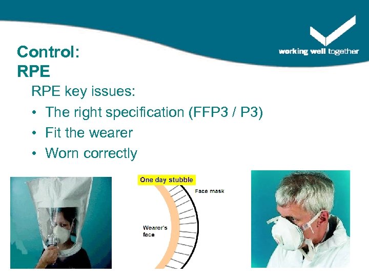Control: RPE key issues: • The right specification (FFP 3 / P 3) • Fit the wearer • Worn correctly