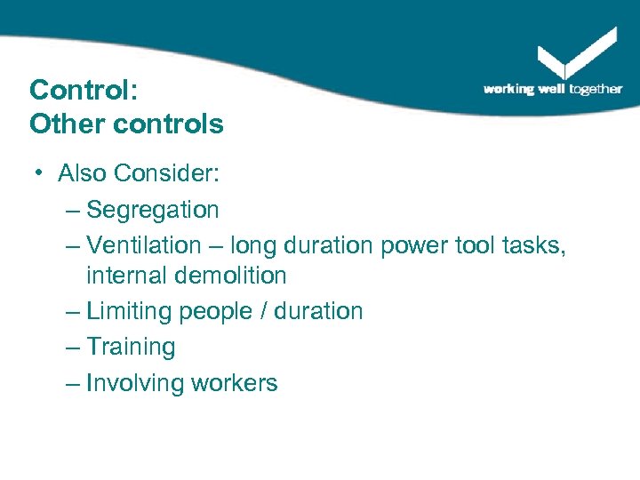 Control: Other controls • Also Consider: – Segregation – Ventilation – long duration power tool tasks, internal demolition – Limiting people / duration – Training – Involving workers