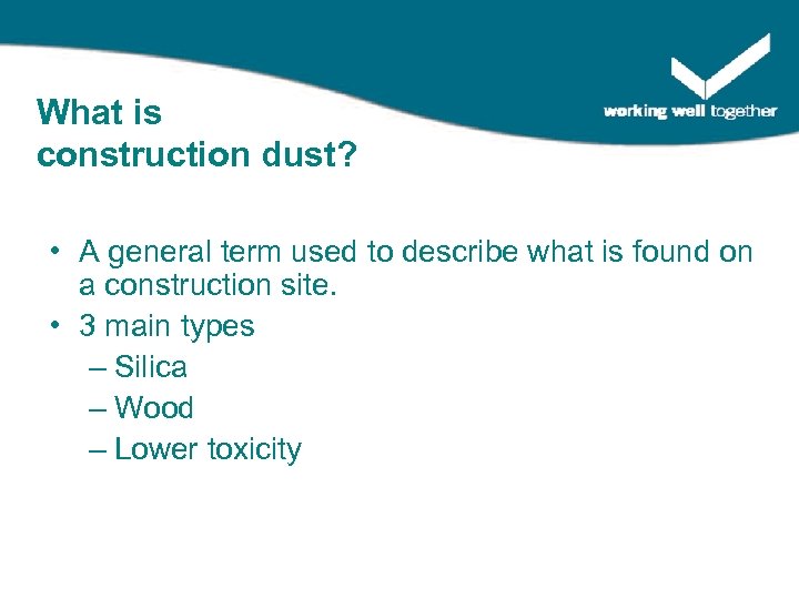 What is construction dust? • A general term used to describe what is found on a construction site. • 3 main types – Silica – Wood – Lower toxicity
