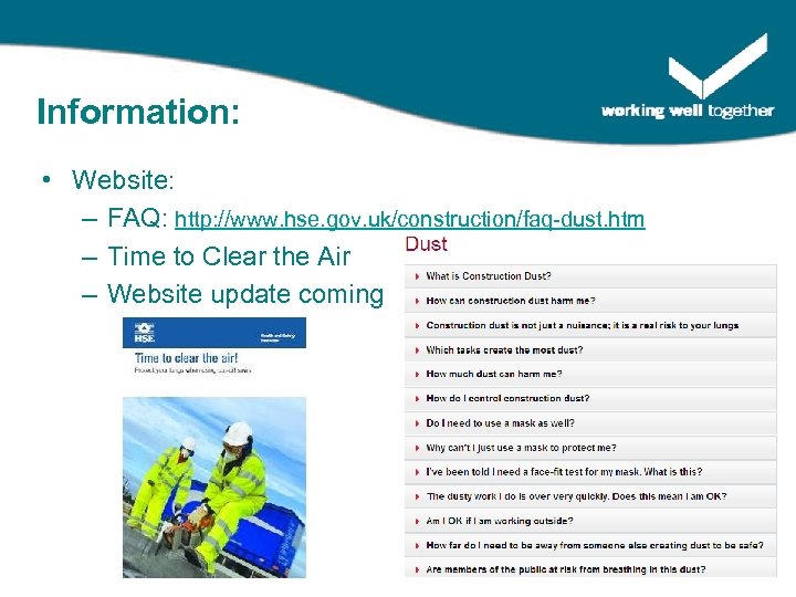 Information: • Website: – FAQ: http: //www. hse. gov. uk/construction/faq-dust. htm – Time to Clear the Air – Website update coming